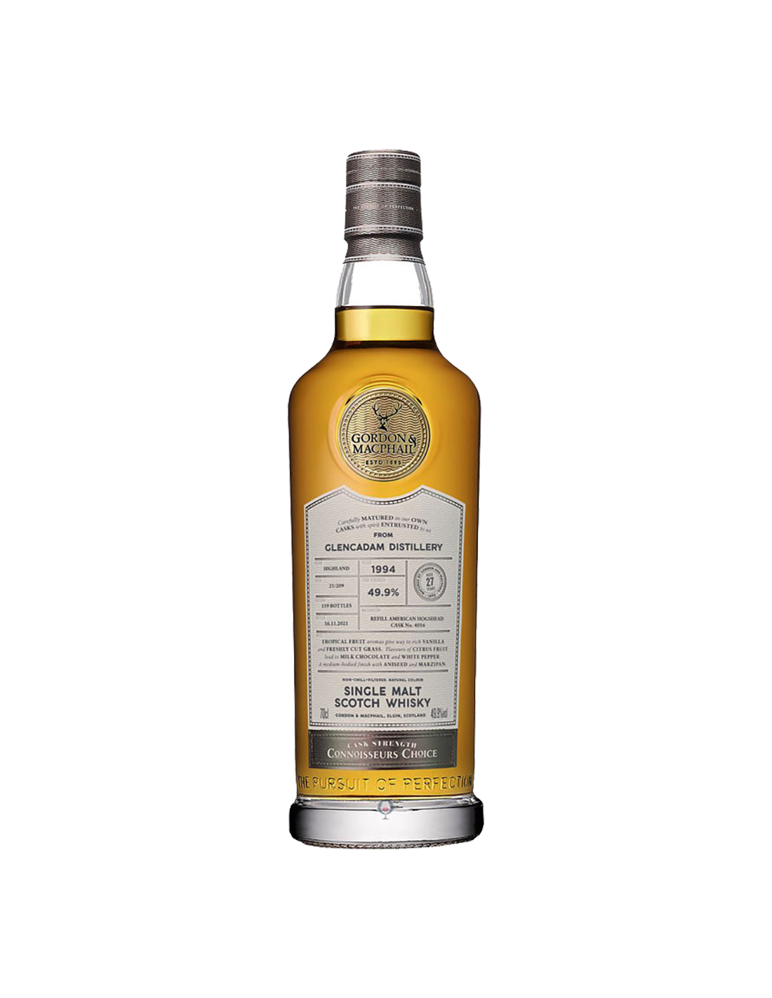Single Malt Scotch Whisky 'Glencadam' Connoisseurs Choice 1994 von Gordon & Macphail wurde 1994 destilliert und 2021 abgefüllt. Alterung 27 Jahre in ehemaligen Sherryfässern. Glencadam befindet sich in der alten Stadt Brechin in den östlichen Highlands von Schottland. Ein Whisky, in dem Aromen von Vanille sich mit Noten von tropischen Früchten und frisch geschnittenem Gras verbinden. Anklänge von Zitrone und Vollmilchschokolade, gefolgt von weißem Pfeffer. Am Gaumen zeigt er sich mit einem mittleren Körper, Aromen von Anissamen und Marzipan. Ein Whisky für Kenner. Cask Strength 49,9° vol.