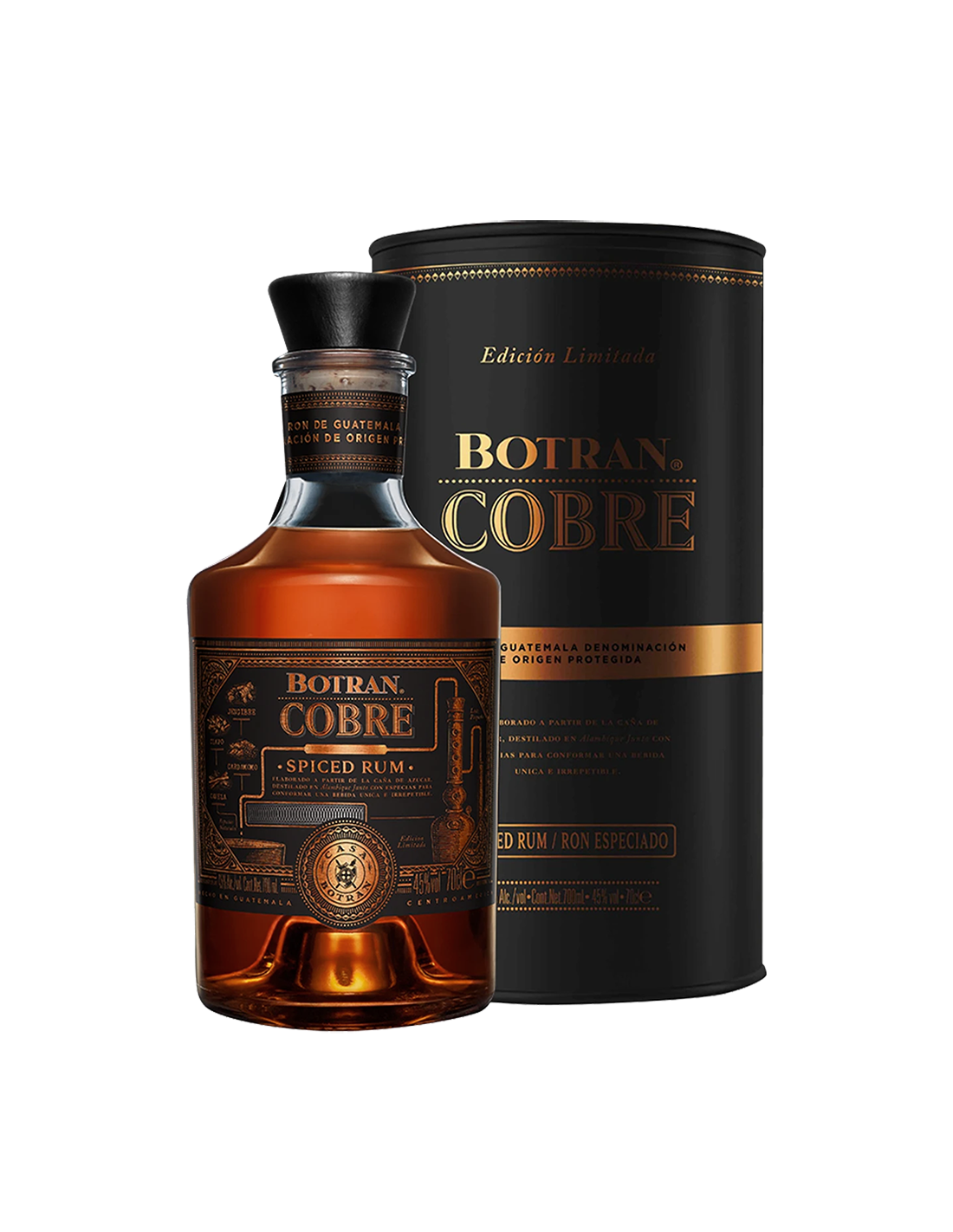 Le Ron de Guatemala Spiced 'Cobre' est une Édition Limitée de Botran inspirée du Ponche, une boisson traditionnelle guatémaltèque, et est réalisée à partir de vanille, cardamome, clous de girofle et gingembre, les éléments essentiels des plus anciennes boissons utilisées lors des fêtes du Guatemala. Ces botaniques sont distillées dans des alambics en cuivre (cobre) à l'intérieur de paniers spéciaux qui permettent aux vapeurs alcooliques de s'imprégner de leurs nuances aromatiques. Associées à une combinaison de rhums de miel vierge jeunes et vieillis par la méthode Solera à plus de 2 300 mètres d'altitude, cela donne naissance à un rhum à la structure longue et complexe, mais avec des notes épicées uniques et délicates. Il est produit en quantité limitée à 10 000 bouteilles.