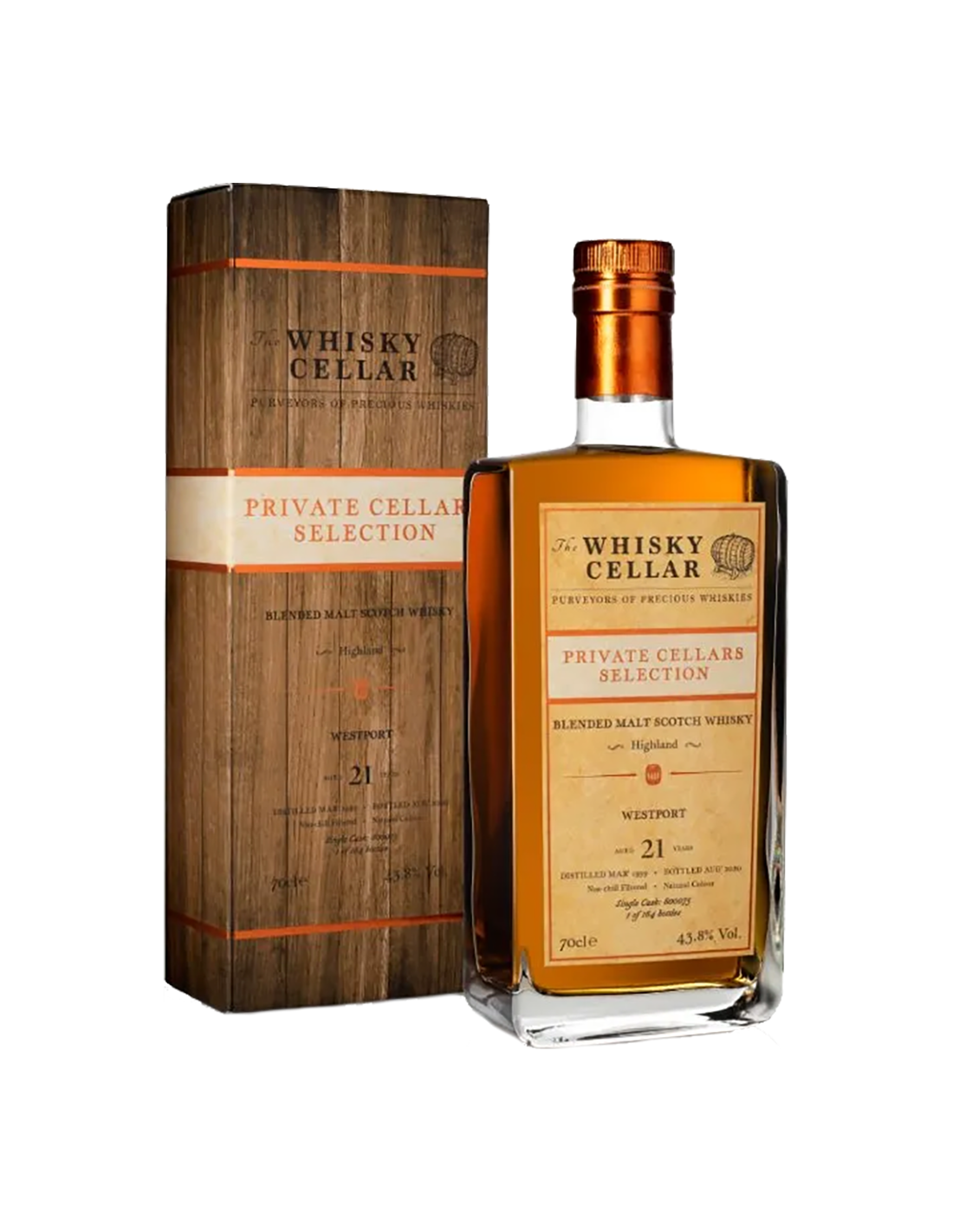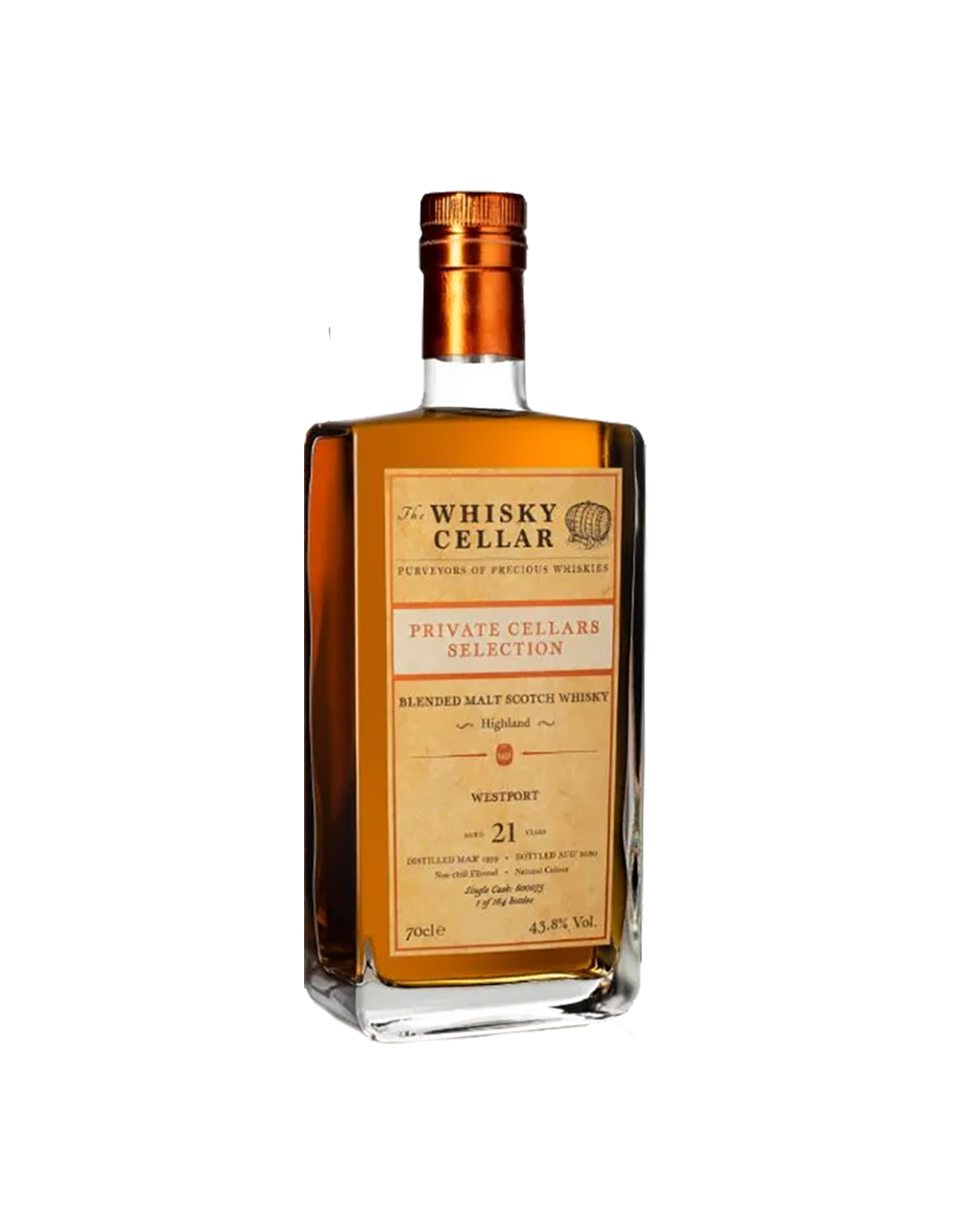 Le Blended Malt Scotch Whisky 'Westport' 1999 21 Ans de The Whisky Cellar fait partie de la sélection exclusive et très raffinée ligne 'Private Cellars Selection'. Ce whisky léger et très séduisant, provient de la distillerie de Westport dans les Highlands. Vieilli pendant 21 ans dans un fût en chêne américain, il a été distillé en mars 1999 et mis en bouteille en août 2020. C'est un whisky 'tea-spooned' : une cuillère à café d'une distillerie spécifique a été ajoutée à un fût contenant le distillat d'une autre distillerie, résultant en un whisky blended, dont 99% est du Highland Single Malt. Arômes de miel de bruyère, de fleurs de citron et de prunes jaunes mûres. En bouche, il est délicieusement léger et délicatement sucré, la finale est douce et persistante. Seulement 164 bouteilles ont été produites.