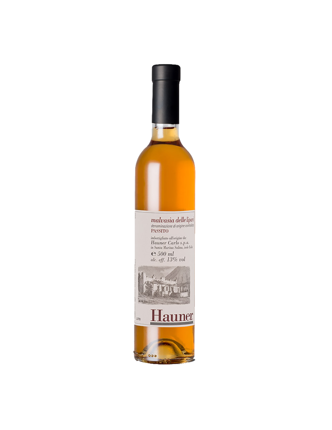 Malvasia delle Lipari Passito"of"HaunerIt is a sweet, fresh, and aromatic passito wine produced in Lingua on the island of Salina, part of the Aeolian archipelago in Sicily. It is made primarily from Malvasia di Lipari grapes, with a small percentage of Corinto Nero, carefully selected and hand-harvested late, at the peak of their ripeness. The bunches are then left to dry on racks in the open air for 15-20 days before being pressed. It exudes complex and intricate aromas of aromatic herbs, nougat, and dried fruit. The taste is full, sweet, and seductive with great sapidity and freshness, warm. An imposing and elegant passito, pleasantly honeyed and nutty.