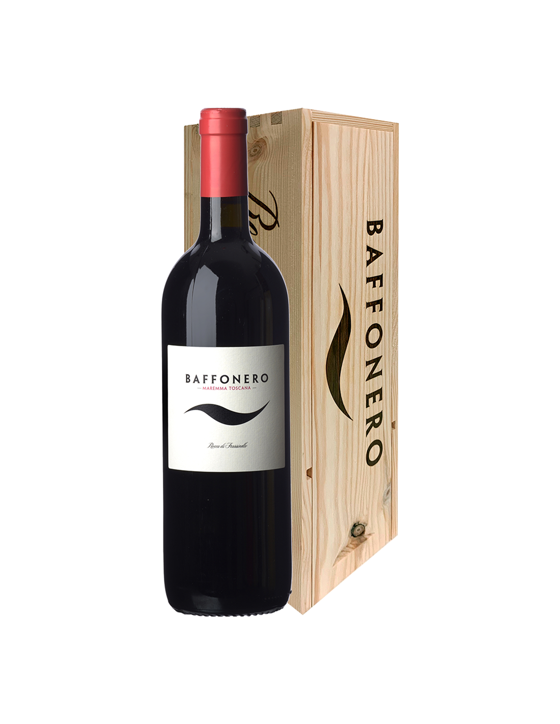 Il Baffonero 2020 Maremma Toscana DOC Merlot di Rocca di Frassinello è un prestigioso Supertuscan, nato dall’omonima vigna orientata Nord/Sud-Ovest e costantemente ventilata dal Maestrale, che mitiga il caldo e rallenta la maturazione. L’escursione termica esalta aromi e freschezza, mentre i suoli di scisti argillosi garantiscono drenaggio e grappoli piccoli e compatti, ricchi di tannini e concentrazione. La gestione manuale con selezione dei germogli e diradamento porta equilibrio naturale. Le uve, raccolte a mano e vinificate in acciaio, affinano 14 mesi in barrique di rovere francese e ulteriori 12 in bottiglia. Al calice offre profumi intensi di frutti neri, spezie e cacao, con tannini vellutati e struttura imponente. Elegante e persistente, accompagna selvaggina, carni rosse e formaggi stagionati, rivelandosi vino da meditazione dal grande potenziale evolutivo.